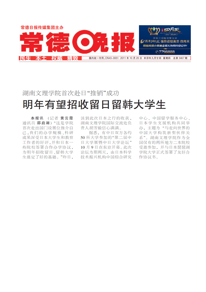 《常德晚报》湖南文理学院明年有望招收留日留韩大学生