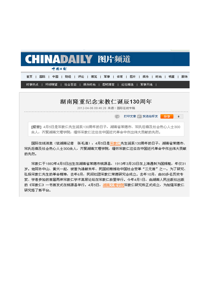 《中国日报》:湖南隆重纪念宋教仁诞辰130周年