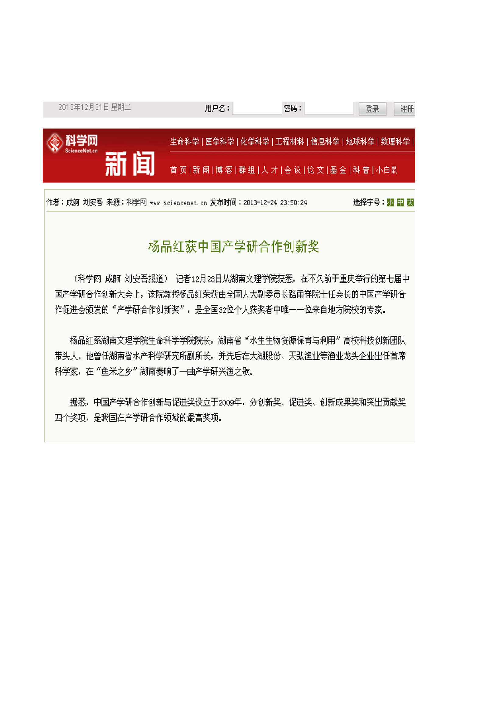 杨品红获中国产学研合作创新奖科学网